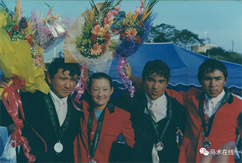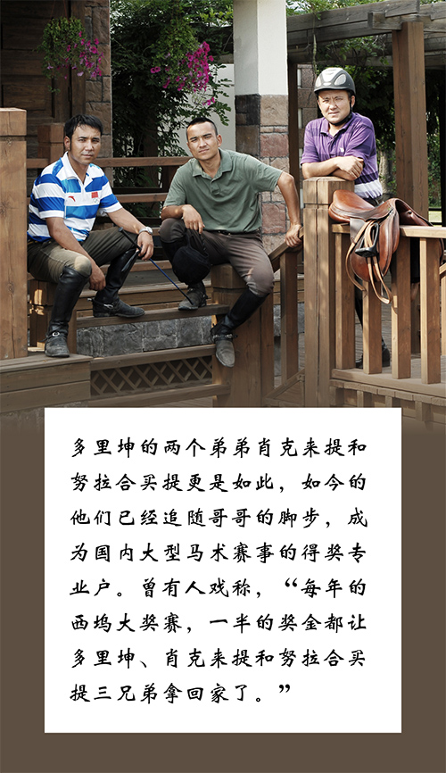 1982年12月8日,中國馬術(shù)協(xié)會成為國際馬術(shù)聯(lián)合會正式成員,自此中國馬術(shù)邁出了重要的一步。至2022年,中國的馬術(shù)運動已歷經(jīng)四十年風(fēng)風(fēng)雨雨?!恶R術(shù)》雜志推出《中國馬術(shù)四十年》特別策劃,講述那些為中國馬術(shù)做出貢獻的人物故事。時光易逝,彩云易散,縱然歷史的車輪滾滾向前,我們依舊能在時光的車轍中,找到值得我們銘記的那些人、那些事。 初見多里坤·阿拜,他默默坐在騎手中央,并不起眼,提到采訪,他站起身,滿臉隨和,“好啊,這里比較吵,你們看去后面采訪行不行?”說話之間,他已經(jīng)站起身,帶著我們向后走。時光給他的臉上添了幾道皺紋,但依舊能看得出當(dāng)年那年輕帥氣的臉。眼前這位個子不高、長相溫和、戴著沾了馬場土灰的鳥巢大師賽帽子的中年男人,很難與8屆全運會元老,帶領(lǐng)家族兄弟7人走向馬術(shù)賽場的如此有感染力、有威信的家族大哥聯(lián)系起來。 這位站在鏡頭前,看似有點兒拘謹(jǐn)?shù)闹心耆耸亲尯芏?,尤其是家鄉(xiāng),新疆維吾爾自治區(qū)的年輕人肅然起敬、譽為傳奇的真正馬語者。 提到多里坤,家鄉(xiāng)的親戚,鄰里街坊都知道他有一連串傲人的成績,11歲獲得內(nèi)蒙古馬術(shù)錦標(biāo)賽速度冠軍、15歲獲全國馬術(shù)錦標(biāo)賽場地障礙賽亞軍、日本國際馬術(shù)大賽場地障礙賽第六名、21歲成為全運會馬術(shù)團體冠軍成員。這些成績似乎都在訴說著他在馬術(shù)領(lǐng)域是多么有天賦,畢竟年紀(jì)輕輕就獲得了諸多成就。但熟知的他人一定明白,這些成績背后的不易。 多里坤·騎馬40年 父親的支持 多里坤的父親是新疆伊犁哈薩克自治州昭蘇種馬場的一位獸醫(yī),很小的時候,多里坤就經(jīng)常騎在馬背上跟著父親四處行醫(yī),并漸漸顯露出了他的馬術(shù)天賦。1982年年僅10歲的多里坤被新疆隊的領(lǐng)導(dǎo)發(fā)現(xiàn),于是來給多里坤的父親做工作,希望他能進入馬術(shù)隊?!捌鸪醺赣H是不同意的,但是因為我很喜歡,最終還是尊重了我的選擇,連帶父親最喜歡的大青馬一起,都托付給了伊犁體育局。” 經(jīng)過一年的訓(xùn)練,11歲的多里坤一出場就拿到了1000米冠軍,還破了比賽記錄。在之后的四年里,他拿到了很多速度賽的冠軍,破了多項紀(jì)錄,捧了多個獎杯。1987年,多里坤被挑入新疆隊,訓(xùn)練基地在烏魯木齊。因為離家遠,父親放心不下,跟著多里坤一起到了馬術(shù)隊訓(xùn)練。但埋頭苦練了一段時間后,家里的來信不得不讓多里坤放棄了自己的馬術(shù)事業(yè)。 “家里6個孩子,我排行老二,父親來烏魯木齊陪我,家里根本忙不過來,家中的牛沒人照料,都死了。”為了照顧家,多里坤只得跟著父親回去。但不到一年的時間,家里又接到新疆馬術(shù)隊的電報,張漢文教練三次邀請多里坤回烏魯木齊體工二大隊訓(xùn)練,感受到了真誠,多里坤父親最終同意了多里坤一個人回馬術(shù)隊訓(xùn)練。也是從這個時候起,多里坤從一位速度賽騎手,轉(zhuǎn)型成為場地障礙騎手。 經(jīng)過一年的訓(xùn)練,在1988年,新疆隊來到北京參加全國馬術(shù)場地障礙錦標(biāo)賽。那個時候交通還不是很方便,他們乘火車整整10天才來到北京,之后準(zhǔn)備了一個月,大家都是既承擔(dān)繁重的訓(xùn)練工作,同時承擔(dān)馬工和后勤工作。就這樣,功夫不負有心人,新疆隊在這次比賽中獲得了亞軍。也因著這樣的機會,多里坤獲得了入選國家隊,代表中國參加日本國際馬術(shù)大賽的機會?!澳莻€時候才15歲,心里還是怕的,隊友們都回去了,只剩下我,在北京體育大學(xué)又訓(xùn)練了一個月。好在抽簽時很幸運,拿了個好馬,取得了個人第六的成績?!?/div> 2001年,廣州九運會,新疆隊獲得團體第二,多里坤、加納古麗、努拉合買提、吉恩斯(從左至右) 時間轉(zhuǎn)到1991年,新疆隊終于籌到資金,把包含多里坤在內(nèi)的幾名馬術(shù)運動員送往吉爾吉斯訓(xùn)練。兩年后,多里坤回到烏魯木齊,準(zhǔn)備1993年的全運會。期間,他回到家看望了一次久別的家人?!案杏X支撐著家庭的、曾經(jīng)印象中高大的父親,一下子老了很多。我也沒想到,那次竟是最后一次見父親?!?/div> 回到烏魯木齊之后,多里坤就總牽掛著家人。有一次,他夢到了父親,但夢到父親去世了。醒來時滿臉淚痕。隊友們都問,你昨晚干嘛了?又哭又叫的喊你父親。心里陣陣不安的多里坤,急忙寫信給家里詢問情況。家里來信說一切都好,叫多里坤安心準(zhǔn)備,打好比賽。雖然家里的回信,讓多里坤的不安得到了少許緩解,但莫名的陰郁總是揮之不去。 這陰郁直接影響到了10月份參加的全運會比賽賽場。一向競技水準(zhǔn)相當(dāng)穩(wěn)定的多里坤,居然頻頻出現(xiàn)失誤,當(dāng)天個人比賽一無所獲。好在第二天的團體賽上,多里坤發(fā)揮正常,與隊友一起,為新疆隊拿下了團體冠軍。 雖然多里坤已經(jīng)助新疆隊拿到了團體冠軍,可他仍舊半點也開心不起來。那年隊友們放假后都選擇乘飛機回新疆,只有他一個人選擇坐三天的火車回去?;厝ブ蟛诺弥赣H早在半年前就因突發(fā)重病,醫(yī)治無效去世。 父親去世后,家庭的重擔(dān)就全部壓在了多里坤的身上。在隊里,多里坤幾乎不花錢,但體工隊的收入畢竟微薄,通過賽場上的朋友,多里坤了解到北京馬術(shù)俱樂部的