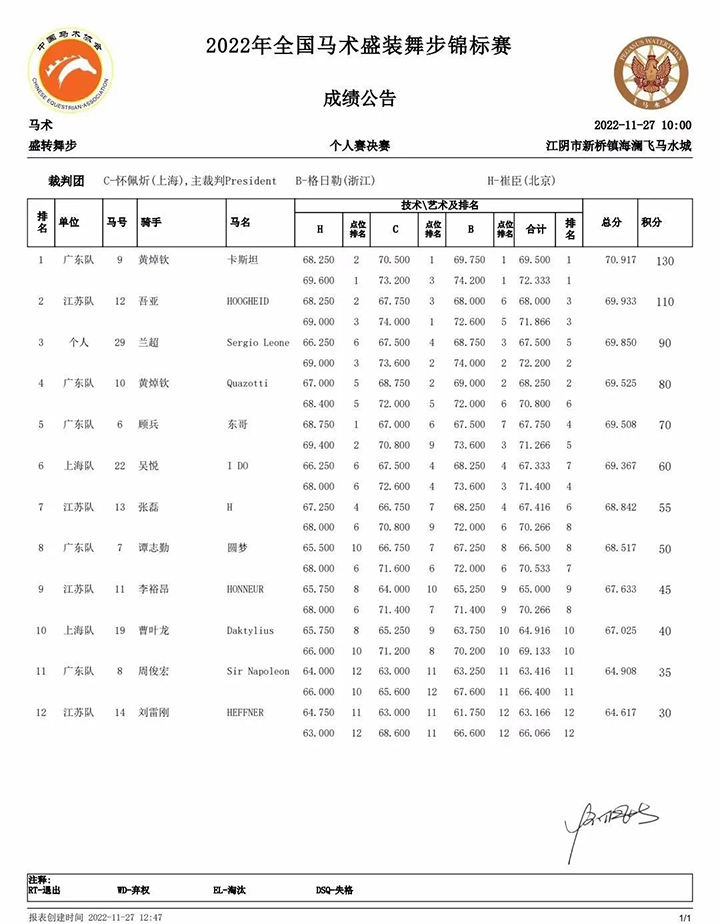 北京時間11月27日,2022年全國盛裝舞步錦標(biāo)賽個人賽決賽在江蘇省海瀾飛馬水城落下帷幕。廣東隊(duì)黃焯欽策騎“卡斯坦”以70.917分獲得個人冠軍,江蘇隊(duì)吾亞搭檔“HOOGHEID”以69.933分獲得個人亞軍,蘭超策騎“Sergio Leone”以69.850分獲得個人季軍。 個人賽頒獎 黃焯欽策騎“卡斯坦” 北京時間11月25日,2022年全國盛裝舞步錦標(biāo)賽團(tuán)體賽成績揭曉。由周俊宏搭檔“Sir Napoleon”、譚志勤搭檔“圓夢”、顧兵搭檔“東哥”和黃焯欽搭檔“卡斯坦”組成的廣東隊(duì)獲得團(tuán)體冠軍,由劉雷剛搭檔“HEFFNER”、張磊搭檔“H”、李裕昂搭檔“HONNEUR”和吾亞搭檔“HOOGHEID”組成的江蘇隊(duì)獲得團(tuán)體亞軍,由海米提·地力木熱提搭檔“Royal Red”、吳悅搭檔“I DO”、曹葉龍搭檔“Daktylius”和富一師搭檔“Lady Gagga”組成的上海隊(duì)斬獲團(tuán)體季軍。 團(tuán)體賽頒獎 團(tuán)體賽同時作為個人資格賽,來自廣東隊(duì)、江蘇隊(duì)、上海隊(duì)和甘肅隊(duì)四支隊(duì)伍和15位參加個人賽共計(jì)31對人馬組合參與比拼。顧兵、黃焯欽(搭檔兩匹馬)、吾亞、吳悅、譚志勤、李裕昂、蘭超、張磊、富一師、林梓濠、曹葉龍、海米提?地力木熱提、周俊宏、和兵兵、王一伊、劉雷剛、鄭治森、邱惠怡和王代雪共計(jì)19位騎手、20對人馬組合名次列前,進(jìn)入個人賽預(yù)賽。 11月26日上演的個人賽預(yù)賽中,黃焯欽(搭檔兩匹馬)、吾亞、顧兵、吳悅、蘭超、張磊、李裕昂、林梓濠、曹葉龍、劉雷剛和譚志勤共計(jì)11位騎手、12對人馬組合進(jìn)入個人賽決賽。 個人賽決賽成績公告 2022年全國馬術(shù)盛裝舞步錦標(biāo)賽歷時三天,在面臨各種挑戰(zhàn)的情況下,依舊如期舉辦,這離不開辦賽方全體工作人員的付出和各參賽隊(duì)伍、參賽騎手的熱情參與。 圖/中國馬術(shù)協(xié)會、林梓濠 |
