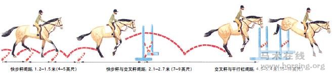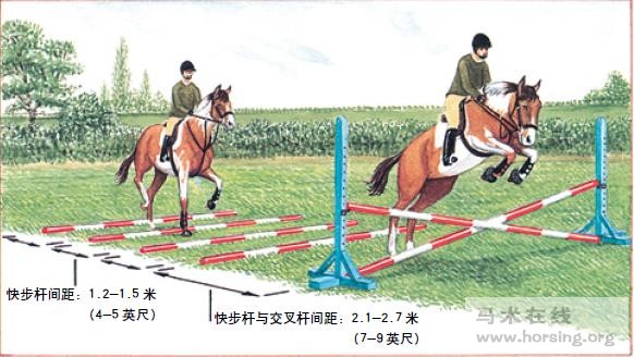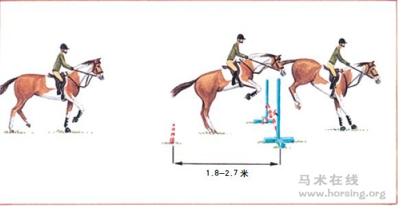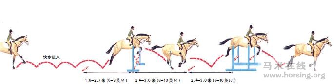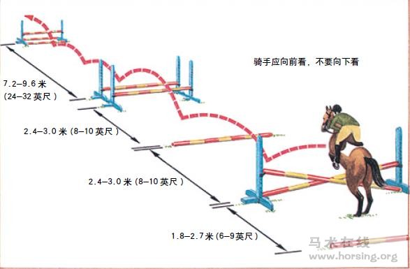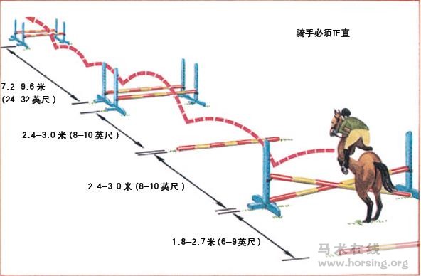 介紹復合障礙 在要求一匹馬跳越一道復合障礙前,應當讓馬熟悉放在一個簡單障礙前的地桿的位置。這個快步桿(用快步接近)有助于馬匹在正確的位置起跳。如果馬匹不明白如何應對這個地桿,那么對以后的一些復合障礙的練習就會造成不利的影響。 快步桿應該放在距交叉桿1.8-2.7 米遠的位置,這將意味著馬匹應當跨過地桿后再跳越障礙。如果馬匹快步越過地桿,那它就不能很好地越過障礙。 在接近障礙時,騎手必須全神貫注地保持馬匹平衡、正直、有節(jié)奏地向前運動,兩腿緊貼于馬的肋側,當馬到達地桿時兩腿向內靠壓鼓勵馬去跳越。在最后時刻騎手萬萬不可改變姿勢或推進馬匹伸展背腰跳越。時刻牢記跳越障礙時是馬在跳越而不是騎手在跳越,不要試圖用你的身體去影響馬的跳越。 設置一個交叉桿的目的是使馬匹能從障礙的中間跳過。馬匹總是能從中間跳越障礙很重要,這也取決于騎手正確的引導。 當馬匹能熟練地應對這一訓練時,交叉桿障礙可以改為垂直桿,距地面30-60 厘米,這是鼓勵馬匹用飛節(jié)跳越的一個有效方法,并可幫助騎手感覺節(jié)奏和平衡。 快步地桿到交叉桿 在交叉桿前面放置3-4 個快步桿,間距為1.2-1.5米,最后一個桿與交叉桿之間的距離應為2.1-2.7米。這個練習非常有助于讓騎手在跳越前保持節(jié)奏和平衡。如果騎手試圖通過推進馬匹進入障礙而使馬的平衡或節(jié)奏發(fā)生改變,馬匹就不能做這個練習。在最后一個桿和障礙之間有一步快步的空間,但是如果馬匹失去了節(jié)奏和平衡,就不能夠留出那一步的空間。騎手上身的任何運動都會影響馬匹,這實際上是對騎手騎姿動作的一個測試。 知道了快步保持平衡和節(jié)奏的那種好的感覺后,再結合向前的運動,在跑步接近障礙時也同樣能做到。有人經常會看到一些騎手在跳越時對他們的馬匹大聲叫喊,這樣在最后的幾步馬匹就會加大步伐而失去平衡,在這個時候保持節(jié)奏、平衡、推進力和騎手的姿勢同樣是非常重要的。 騎手應用輕快步接近障礙做這個練習,上身從髖部以上略向前傾,為最后跳越做好準備。騎手應看著第一個桿直到在馬耳的下方消失,然后看著障礙,感覺同樣的快步節(jié)奏跨越全部地桿和跳越障礙。重要的是騎手決不能先于馬提前做出跳越的動作,這個練習將會證實這樣做是錯誤的。 交叉桿到平行雙橫木 這是最簡單的一種復合障礙,是在快步桿到交叉桿的基礎上,在距交叉桿2.4-3.0 米處加放一個地桿,再在距此地桿2.4-3.0 米處放置一個小的平行欄。這種復合障礙的作用是訓練馬匹有一個良好的跳越技術??觳綏U和交叉桿可使馬匹跳越進入到平行欄的正確起跳位置。為了越過這個寬障礙而又不觸及前桿,馬必須抬高前肢和肩部并向后收起前肢。這時馬匹決不能因騎手的控制限制它后肢的運動,而后肢要抬起向后伸。 讓一匹新馬做這個訓練應用小的障礙,但對一匹馬很有經驗的成年馬障礙可按要求設置。這對任何標準的馬匹都是一個有用的練習,同時對騎手也是一個很好的測試。 騎手必須能始終保持它的姿勢,保持重心在腳跟,坐穩(wěn),抬頭目視前方,肩部不能趴在馬匹頸部上方,必須允許馬匹充分使用它的頭和頸跳越。 騎手應用一個平衡、有節(jié)奏的快步前進接近障礙,保持兩腿緊貼于馬的肋側,但允許馬去跳越。騎手必須讓馬匹在他的控制下跳越,但也不能因上身過早或過度的前傾給馬的肩部增加壓力。當你騎馬離開復合障礙時,你要確保立即恢復節(jié)奏。 快步地桿到交叉桿到平行雙橫木 這是上一個復合障礙的一種變化形式,在障礙前有4 個快步桿,最后一個桿距交叉桿2.1-2.7米遠,然后距交叉桿4.5-5.4 米遠處是一個平行桿。因為在交叉桿與平行欄之間的距離比較長,在中間不需要放置地桿。 這兩種復合欄的不同之處是,在這個復合欄由于地桿的作用馬匹更能平衡到達起跳位置,騎手也必須平穩(wěn)騎坐,而在前一個復合欄卻需要騎手移動上身鼓勵馬匹跳越第一個桿。 在這個練習中,上身的任何動作都將會影響馬匹跨越最初幾個桿。 在整個練習中,騎手身體的動作做到最小的程度是很重要的。騎手必須在允許馬匹跳越的同時上身從髖部以上向外前傾(但不能太向前傾),然后保持這種姿勢直到練習結束。如果在跳第一個欄時騎手上身過度前傾,那他在跳越第二個桿前就不得不將上身挺起,這種額外的動作會使馬匹失去平衡,可能引起馬匹碰撞第二個欄。這個訓練時騎手學習盡可能平穩(wěn)騎坐的一個好的訓練方法。一個騎手必須做到人馬結合,或盡力為他的馬匹提供越過障礙的最大機會。經常會看到由于騎手身體的額外動作而造成馬匹碰撞障礙欄,所以,騎手的姿勢是十分重要的,因為它既能幫助馬匹跳越又能妨礙馬匹跳越。 簡單單橫木復合障礙 這是交叉桿到平行欄這個基本訓練的一個擴展,是在距平行欄兩短步7.2-9.6 米遠處增加一個垂直欄。在距垂直欄60 厘米處應放置一個地桿幫助馬匹“后退”(在起跳之前只是縮短其步幅幫助起跳)。 這個訓練的騎乘原則與上一個練習相同,騎手要允許馬去跳越每一個障礙并在騎手的控制下跳越;必須盡可能地平穩(wěn)騎坐,上身的動作做到最小的程度;絕不能影響馬匹在平行欄與垂直欄中間的步態(tài),但要盡力保持節(jié)奏和平衡。 如果馬匹失去推進力,騎手應兩腿向內靠壓(但保持身體不動)