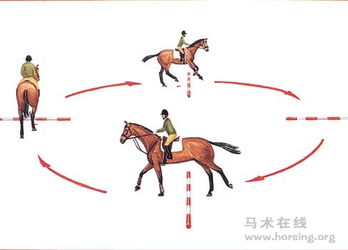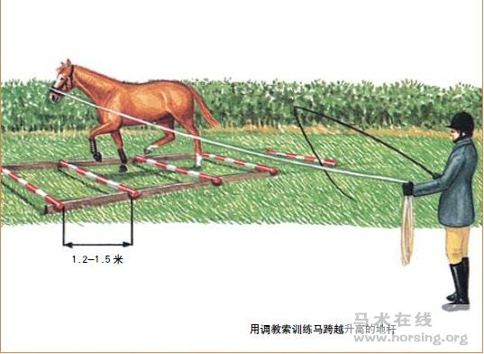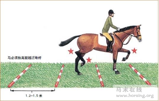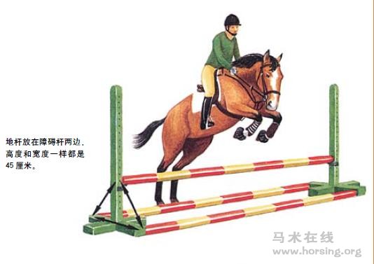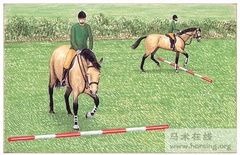 緒論 地桿和復合小障礙對訓練年輕馬匹跳越很有用,對新馬和有經(jīng)驗的馬匹的柔韌性訓練同樣有用。這種訓練對馬的平地運動非常有益,因為它能伸展馬匹的背部,放松其他肌肉和關節(jié)。 在各種復合障礙中地桿與障礙間的距離是個概數(shù)。短的距離適合矮馬,長的距離適合其他馬,但是要根據(jù)具體情況而確定。依據(jù)一匹馬的平均步幅,其距離應是3.6 米,矮馬的距離是2.7 米。 訓練必須先從非常矮的障礙練起,只有當你知道這個距離適合你的馬時才可增加高度。 訓練時必須要有教練指導,千萬不要自己一個人跳障礙,以防發(fā)生事故。 訓練馬匹跳越與平地運動一樣,馬匹必須沉靜、有節(jié)奏并保持平衡。如果馬匹緊張,跳越就僵硬不敏捷。因為馬不能保持節(jié)奏和平衡,接近障礙時也是個問題。 復合障礙給了騎手跳躍障礙時調(diào)整姿勢的一個機會。騎手必須利用穩(wěn)固的小腿保持平衡,跳起騰空時絕不能趴在馬的頸部上方,但上方應向前傾,目視著前方下一個障礙。 馬匹在跳躍障礙時其頭和頸必須是自由的,這樣才能保持平衡,因此,騎手的手必須在馬起跳時隨著韁繩前伸。 單地桿 下面就是如何教一匹馬第一次跳越。開始要讓馬匹慢步跨過一個單地桿。當馬第一次看到地桿時會用不同的方式抵抗,一些馬會毫不猶地跨過地桿,一些馬可能會跳過地桿,還有的馬可能會拒絕跨越地桿。即使是拒絕跨越,騎手也絕不允許馬匹離開地桿,一定要讓馬匹跨過地桿。不管馬匹做出怎樣的反應,只要它成功地越過地桿,騎手就必須輕拍馬匹給予鼓勵。 馬匹應從兩個方向和一定的角度慢步跨越地桿。只要馬匹能愉快地跨越地桿,就可以讓馬先快步直線跨過地桿,然后斜線并換個方向跨越。騎手應該時刻使馬匹沉著、自信,保持節(jié)奏和平衡。只有當馬匹接受單桿時才能進行下一步。 跑步接近地桿是保持節(jié)奏的一個很好的練習。馬匹無論年輕或年老都會受益于這個訓練,對于有經(jīng)驗的騎手和新騎手也同樣有益。騎手應采用前傾姿勢跑步越過地桿,馬匹應該保持同樣的姿勢和節(jié)奏,既不加速也不抵抗。騎手應目視地桿以便能判斷馬匹是否在用同樣的步伐接近地桿,如果看到馬匹將離地桿太近,可以握緊手指收韁縮短步幅,或根據(jù)需要松開手指放松韁繩伸長步幅,這對判斷距離是一個很好的練習。 快步地桿 在單地桿基礎上再增加幾個桿就成為一排快步桿。根據(jù)馬匹或矮馬的步幅長度,快步桿的間隔距離應為1.2-1.5 米,跨域地桿時馬匹既不用伸長步幅也不用縮短步幅。 增多的地桿應逐步地增加,尤其是對年輕的馬匹,不要突然讓它跨越很多地桿,一次最多6根地桿。 當你訓練馬匹跨越地桿時,腦子里要時刻牢記鎮(zhèn)靜、向前運動、節(jié)奏和平衡這幾個基本原則。地桿不但有助于在這幾個方面提高訓練水平,而且還能增強身體的柔軟性。馬匹必須抬高它的腿越過地桿,這樣可以鍛煉馬的腕關節(jié)、飛節(jié)、球節(jié)、膝關節(jié)和肩關節(jié)。 在接近或跨越地桿時,騎手都應當和馬匹保持輕輕的聯(lián)系,但絕不能限制馬匹。馬匹不需要過多伸長頭頸跨越地桿,但要保持自身的平衡。騎手應用輕快步以便讓馬的背部擺動。壓浪快步會使馬的背部僵硬,應讓馬背部承受最小的重量以促進柔軟性。 你可以從一定距離以外或轉(zhuǎn)一個圈接近地桿,可用地桿擺成一個“8”字形練習,這樣你每做一次都能變換一次方向,這會幫助馬匹改善柔軟性,因為馬匹會用飛節(jié)跨越地桿,這將為以后的轉(zhuǎn)彎做更多的準備。 如果馬匹想試圖改變節(jié)奏或速度去接近地桿,騎手應當用半減卻給予糾正。 用調(diào)教索打圈跨越快步地桿 訓練馬匹柔軟性的一個很有用的方法就是用調(diào)教索讓馬打圈跨越快步桿。把快步桿放在一個圓圈上,在圓的中心一側(cè)快步桿的間距為1.2-1.5米,最多不超過6 個桿,鼓勵馬自己完成整個圓圈并改善節(jié)奏和平衡。因為沒有騎手的重力,馬匹沒有任何限制,必須靠自己跨越全部地桿。 如果馬匹沒有任何副韁能自然地保持一個好的外形,這是最理想的,但是如果馬匹把它的頭高高地昂起,放松一些副韁會鼓勵馬匹保持一個比較好的姿勢運動。副韁不必太緊,否則馬匹跨越地桿時背部會僵硬。 在馬匹以后的訓練中,如訓練一匹成熟的馬,可以要求它跨越升高的快步桿。用2 根在需要的位置做一個凹槽的條木將地桿升高幾英寸,增加高度可使馬匹更努力地跨越,因為它不得不抬高腿去跨越地桿。第一個地桿應當放在地面上,這樣如果馬判斷錯了地桿的距離,也不會被絆倒。 馬匹在跨越升高的地桿時不應戴副韁,因為它的頭和頸部需要最大限度的自由來保持自身的平衡。 快步桿能幫助馬匹知道要它做什么,而升高的地桿會使馬重視這些地桿??缭缴叩牡貤U對馬匹來說是一項很累的訓練,訓練不應時間過長,應根據(jù)馬匹的身體狀況而定,但是如果馬匹累了,你會很快發(fā)現(xiàn),那就應當停止訓練。 圓圈跑步跨越地桿 將4 根地桿放在一個直徑為20 米圓圈的4 個等分點的地面上,讓馬先快步跨越地桿,然后再跑步跨越。 這個訓練對馬匹和騎手都是一個好的練習。對馬匹來說,可使馬匹看到正在做的運動,并幫助改善其節(jié)奏和平衡。對騎手來說,會使騎手學會保持節(jié)奏和判斷距離,并可看到前面的下一