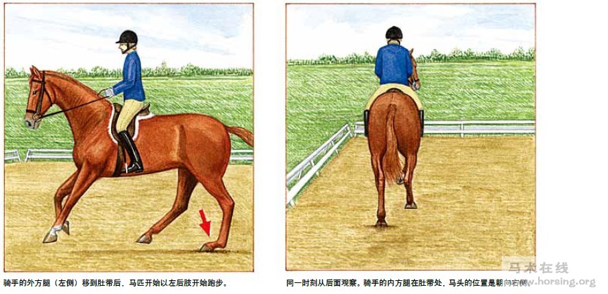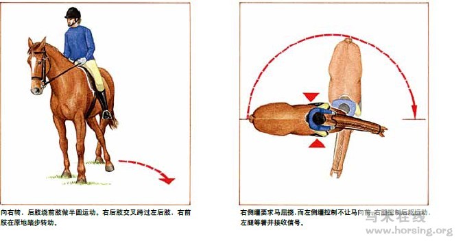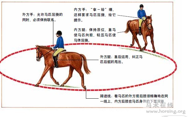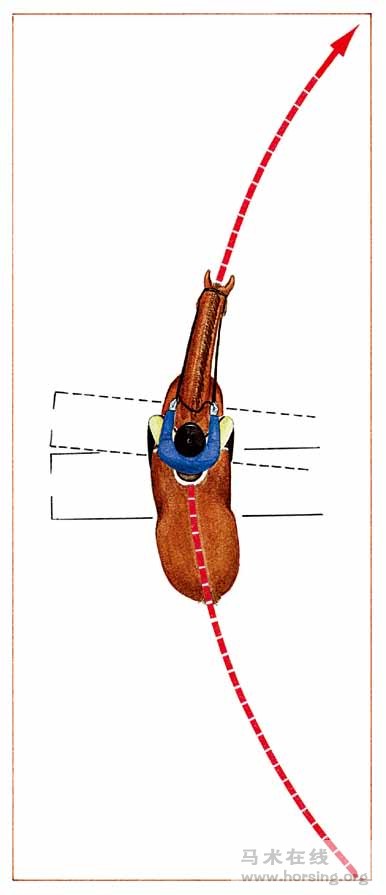對騎手而言任何的模糊要求都會導(dǎo)致不易覺察到的不服從。 騎手要想做好圈程必須在起始點(diǎn)前做幾步準(zhǔn)備。 騎手確認(rèn)馬匹在圈程方向上屈撓,使用內(nèi)方腿和內(nèi)方韁的同時,要保持好外方韁的聯(lián)系。這些都是很微妙的輔助。 在進(jìn)入圈程的起始點(diǎn),騎手應(yīng)很清楚地注視他所行進(jìn)的方向,增加內(nèi)方腿和內(nèi)方韁的輔助。 外方韁扮演著一個很重要的角色,開始做圈程時如果外方韁是松的,圈程就不夠精確。然而如果騎手沒有給出外方韁允許馬匹的脖頸向內(nèi)側(cè)屈撓,那么馬匹不能做出正確的屈撓。 一旦圈程開始,騎手只須保持向前的動力,馬匹正確的屈撓以保持所行路線是圓的就可以了。 馬匹經(jīng)常逃避這種柔軟性練習(xí),例如:不屈撓它的身體,甩出它的后半肢。 在肚帶后的外方腿糾正隨時發(fā)生的問題,如后軀的甩出等。 馬匹應(yīng)該在左圈程和右圈程上同等工作。特別注意的是在換方向時馬體應(yīng)回到正直, 在開始另一方向圈程時馬匹應(yīng)該在新的方向上屈撓。 盡管很多馬匹有一側(cè)是僵硬的,他們必須與外方韁保持好聯(lián)系,不應(yīng)該一側(cè)比另一側(cè)屈撓得多。 應(yīng)避免發(fā)生的錯誤: 外偏:當(dāng)馬匹向內(nèi)方屈撓太多時,它的外側(cè)肩就會向外甩。 糾正錯誤:與外方韁有更多的聯(lián)系,外方腿有更穩(wěn)定的輔助。 內(nèi)偏:當(dāng)馬匹向外方屈撓太多時,就會倒向內(nèi)側(cè)。增加內(nèi)方腿輔助的力度,輕輕地拿- 給內(nèi)方韁。 內(nèi)偏:馬匹向外方屈撓,騎手的重心在馬匹的內(nèi)方肩。騎手更應(yīng)使用更有力的輔助來改變這種錯誤。 定前肢旋轉(zhuǎn) 通常定前肢旋轉(zhuǎn)是騎手學(xué)習(xí)的第一個橫向運(yùn)動。它是一個很重要的練習(xí),這也是騎手第一次相對獨(dú)立運(yùn)用腿和手。 從立定開始做定前肢旋轉(zhuǎn),離開蹄跡線或圍欄至少1.5 米,給馬匹旋轉(zhuǎn)的足夠的空間。 理論上,馬匹立定站好,朝蹄跡線方向轉(zhuǎn)動,它的內(nèi)方(蹄跡線一側(cè))前肢踏步轉(zhuǎn)動,它的后肢繞前肢做半圓動作,一后腿交叉跨過另一后腿。馬應(yīng)該是:向所轉(zhuǎn)的方向屈撓,保持慢步的節(jié)奏,但不要向后邁出。 向右側(cè)做定前肢旋轉(zhuǎn),騎手從左韁開始。遠(yuǎn)離蹄跡線1.5 米處,注意力集中,四肢平穩(wěn)立定站好,用內(nèi)方(右側(cè))韁要求馬匹有輕微的屈撓。(當(dāng)向右轉(zhuǎn)時,馬的右側(cè)就變成新的內(nèi)方)。 外方韁控制不讓馬匹向前,但允許有輕微的屈撓。內(nèi)方腿在肚帶后要求后軀移動。外方腿再向后,必要時控制馬的后肢甩出。 當(dāng)轉(zhuǎn)彎完成時,應(yīng)立即使用讓馬向前的輔助。 |