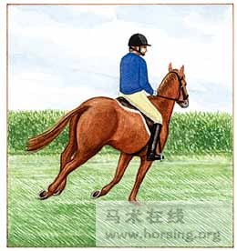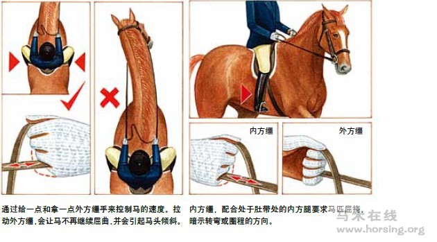 腿所放的位置與用法不同就會產(chǎn)生不同的效果。 為讓馬有更好的動力和向前的欲望,在腿的原有位置快速有力地靠擠壓一下。 讓馬屈撓(彎曲馬匹的身體)腿很穩(wěn)定地與馬體兩側(cè)相應(yīng)位置保持聯(lián)系。 再向后(在肚帶以后)果斷地靠馬一下,指示讓它發(fā)動跑步。 再向后(在肚帶以后)和馬匹體側(cè)保持聯(lián)系,有利于控制馬的后軀運(yùn)動。 與韁的聯(lián)系必須是連續(xù)不間斷的。使用韁的輔助時,無論單雙韁均應(yīng)用“拿- 給”握住-放松手指的方法。 馬頭的動作和手的動作應(yīng)當(dāng)是鏡像關(guān)系,慢步和跑步時,馬頭會經(jīng)常來回反復(fù)地移動??觳綍r,也允許有一些不規(guī)律的動作。馬匹也會向左、向右屈撓,必須允許這樣的動作,但是不要丟掉與韁的聯(lián)系。 手和腳總是配合使用。但不要忘記黃金原則——“腳先于手”。 馬匹的屈撓 騎手應(yīng)完全理解經(jīng)常用到的術(shù)語,“內(nèi)方”“外方”等。 當(dāng)馬匹向右側(cè)行進(jìn)時,術(shù)語“內(nèi)方”是指馬體的右側(cè),“外方”是指馬體的左側(cè)。 騎手要求馬匹向內(nèi)側(cè)屈撓,身體沿著曲線移動。如果圈程很大,馬匹的屈撓是輕微的;當(dāng)圈程縮小時,屈撓明顯變大。 同樣的,馬匹必須朝向轉(zhuǎn)彎的方向屈撓。 內(nèi)外方韁,內(nèi)外方腿的輔助是經(jīng)常用到的術(shù)語,騎手必須很清晰地理解這些術(shù)語,就像區(qū)分左、右一樣清楚。 當(dāng)馬匹向右側(cè)行進(jìn)時,即使馬匹沿長長的直直的場地行進(jìn)同樣被看作是“在右側(cè)韁上”行進(jìn),馬匹的右側(cè)就是內(nèi)方。 內(nèi)方腿在肚帶處,增大壓力使馬屈撓。輕輕給一點(diǎn)“拿- 給”內(nèi)方韁,使馬匹柔軟地向內(nèi)側(cè)屈撓。 外方韁是很重要的,它支持內(nèi)方韁的工作。適度的聯(lián)系防止馬的頸部過分向內(nèi)側(cè)屈撓。必要時,外方腳向后靠一下,控制馬匹的后軀向外甩出。 理論上講,馬匹應(yīng)當(dāng)接受比內(nèi)方更韁穩(wěn)定的外方韁接觸。當(dāng)它進(jìn)步時,騎手才會更充分理解外方韁的價(jià)值。 騎手和馬匹的肩應(yīng)是平行的。(自上而下)騎手和馬匹的髖應(yīng)是平行的。 跑步的輔助 馬匹在左跑步和右跑步時,四肢落地的順序是不同的。騎手應(yīng)充分理解以便正確運(yùn)用跑步輔助。 當(dāng)馬匹向右行進(jìn)時,首先是左后蹄著地,然后是右后和左前蹄一起著地,最后是右前蹄著地。最后著地右前肢稱為“領(lǐng)先腿”。當(dāng)馬匹向左側(cè)跑步時,所有順序是相對應(yīng)的,它的左前肢就是“領(lǐng)先腿”。 對于騎手和馬而言,以指定腿在一處拐彎前跑步是很容易的。 開始右跑步時,騎手以右韁做快步,當(dāng)接近右轉(zhuǎn)彎處,騎手用內(nèi)方腿和內(nèi)方韁正確地要求馬匹屈撓,柔軟地坐到鞍上,外方腳向后到肚帶后,用腿靠一下馬,訓(xùn)練過的馬匹很容易直接發(fā)動跑步。 騎手不應(yīng)失去與韁繩保持的聯(lián)系,否則馬匹跑得更快或失去平衡。騎手須控制自己不前傾,不低頭檢查自己的領(lǐng)先腿是否正確,這樣會使馬失去平衡,騎手越早知道依靠感覺平衡越好。 “錯誤跑步”的馬匹四肢落地順序混亂時,騎手是很不舒服的,也很容易感覺到。騎手應(yīng)該重新做快步,然后跑步。 轉(zhuǎn)彎和圈程 提高馬的柔軟性,可以做各種各樣的圈程、轉(zhuǎn)彎、曲線運(yùn)動。如果騎手正確地要求馬匹,這些練習(xí)會有很大的價(jià)值。 圈程騎乘,騎手必須決定兩件事情:
