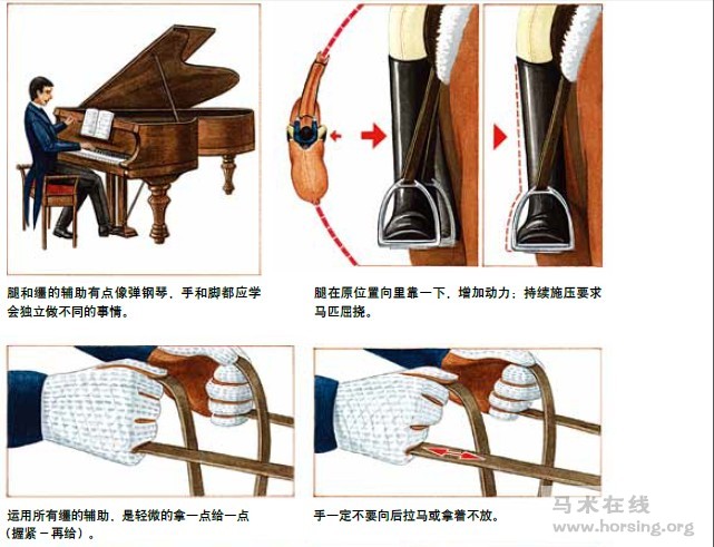 發(fā)展更好的輔助 一旦最基本的停止、啟動和轉(zhuǎn)彎指令被理解并運(yùn)用得當(dāng),對騎手而言就需要發(fā)展新的輔助詞匯。 只有當(dāng)騎手擁有了穩(wěn)定的騎坐,良好的平衡,內(nèi)心的自信,他才可以進(jìn)一步發(fā)展輔助。 當(dāng)騎手可以自然協(xié)調(diào)地與馬配合,完成不同的動作時,他就應(yīng)該開始發(fā)展更為精確的輔助。 手必須學(xué)會彼此獨(dú)立的工作,以不同的方式工作,同時腿也必須獨(dú)立工作。剛開始時是困難的。 腿輔助的兩種形式: