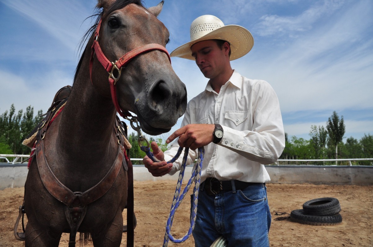 當(dāng)你剛開始學(xué)習(xí)調(diào)訓(xùn)一匹生馬的時(shí)候,首先你要選擇一匹個(gè)性溫和且樂意學(xué)習(xí)的馬。所以我們從馬房選擇了一匹已經(jīng)較為穩(wěn)定的馬匹來作為教學(xué)示范。這是一匹美國夸特馬,也是牛仔們在工作中最常見的馬種,它的體格粗壯、肌肉厚重、外形緊湊,以擅長短距離沖刺而著稱??涮伛R性格敏感而溫順,它將非常樂意配合你完成一系列的訓(xùn)練。 準(zhǔn)備工作 準(zhǔn)備工作在這里顯得尤為重要,你必須預(yù)先整理好需要用到的馬具,包括草籠頭、牽馬繩、汗屜、西部水勒韁及西部鞍。選擇一個(gè)合適的場地——一個(gè)圓形的調(diào)教圈(直徑)就是不錯的選擇。馬是群居動物,對周圍的環(huán)境很敏感,如果場地周圍有其他自由活動的馬匹則可能會影響調(diào)訓(xùn)計(jì)劃,盡可能找到一個(gè)相對安靜、安全的地方,并將準(zhǔn)備好的汗屜、水勒及西部鞍置于場地中央。 由于現(xiàn)在沒有適用的繩索,我選擇了很普通的草籠頭來代替用繩索打的籠頭,這同樣很好用。將馬匹打理干凈后帶進(jìn)場地,為它戴上護(hù)腿,防止它在訓(xùn)練中受傷。 “介紹”鞍具 你在調(diào)教圈內(nèi)要做的第一件事,就是向馬匹“介紹”鞍具。馬匹對于顏色鮮艷、造型奇特的鞍具會相當(dāng)警覺,此時(shí)你需要引導(dǎo)它走近鞍具,同時(shí)安撫它,消除它的恐懼。 接下來,你可以動作緩慢的拿起汗屜,站在馬的左側(cè),像我這樣,用汗屜輕輕拍打馬的身體。如果它反應(yīng)激烈,那么停下動作安撫它,然后繼續(xù);慢慢地它會接受這樣的輕拍,這時(shí)就可以將汗屜放到它的背上。再到馬的右邊做同樣的動作,直到可以將汗屜放在它背上為止。 當(dāng)馬匹接受汗屜時(shí),我們就可以進(jìn)行下一步——從馬的左側(cè)將鞍子直接放到汗屜上,當(dāng)然,動作還是要輕柔。如果是小馬,有的可能就這樣安靜的站著,有的可能會跳,想甩掉鞍子,或者不安靜地扭動身體,這種情況都是很正常的。我們直接將鞍子放上去是為了讓馬匹知道,這個(gè)重量它是可以承受的。它很聰明,當(dāng)感覺背上的東西對自己沒有任何威脅時(shí),它就會慢慢去習(xí)慣。這時(shí)可以扣起肚帶,但不必太緊。 解開牽馬繩,讓馬匹在調(diào)教圈里活動一下。你需要利用牽馬繩來趕圈,讓它習(xí)慣帶著鞍子運(yùn)動,左右里懷各幾圈,同時(shí)嘴里聲音,使它注意力集中,并能理解你動作的意義——讓它動起來。 清楚指令 馬匹會很快適應(yīng)鞍子的重量,停止趕圈,讓它自己安靜下來,接下來我們教它一些簡單的指令。想要抓住它,你可以緩緩靠近,注意它的眼睛是否在觀察你,如果它看你,那么你就往后退一些,如果它不看你,就繼續(xù)靠近。它在觀察你的舉動是否對它有危險(xiǎn),當(dāng)它完全信任你時(shí),就可以抓住它的籠頭,帶上牽馬繩。 我現(xiàn)在將要教你做幾件事,注意這些動作之間的聯(lián)系: 站在馬匹的左側(cè),雙手拿著牽馬繩,往它后方走,同時(shí)左手輕輕拉一下繩就松,重復(fù)幾遍,右手持繩頭輕拍它的身體。 這樣做的目的是讓它明白指令并且向左轉(zhuǎn)。由于牽馬繩很短,它只能繞著你走,看起來有些像是原地轉(zhuǎn)圈,如果它左側(cè)做的很好,那么右側(cè)也需要同樣的練習(xí)。 訓(xùn)練馬匹做交叉步伐有些類似上面的動作,請注意: 此時(shí)你可以站在馬匹的右邊,雙手輕拍它的頸部,這時(shí)右手較左手稍高,好讓它的眼睛注意到你的動作,左手可以拍著它的頸部并稍用力將它往一邊推。 馬匹擁有長而靈活的頸部,它會將頭扭向左側(cè)并往左側(cè)邁步,注意它的前肢是否做到了交叉步伐,如果它做的很好,撫摸它獎勵它,并且換邊再做幾次,讓它清楚你這樣做的目的是在教它新的步伐。 方向訓(xùn)練 打圈是教會馬匹識別方向指令的一個(gè)很直接的舉措,動作和我們之前讓它原地轉(zhuǎn)圈有些類似: 站在它的右側(cè)面對它,右手持牽馬繩(稍放長一些,約一米),左手較右手更高,好讓馬匹注意到后方你的動作,這時(shí)拿著繩頭向它的后軀輕輕揮動一下,口中發(fā)出“嘖嘖”的聲音。 馬匹會明白你是要它向前,但由于你的牽引,它只能順時(shí)針繞著你走。另一側(cè)用同樣的方式做幾次,讓馬匹知道你的動作和聲音是要它有所行動,是前進(jìn)的指令,而繩索正是引導(dǎo)它前進(jìn)的方向。 這是訓(xùn)練一匹生馬時(shí)你必須要做的事情,并且要反復(fù)去做,令馬匹印象深刻。當(dāng)你騎在馬背上的時(shí)候,你會需要讓馬匹往各個(gè)方向去——而這個(gè)訓(xùn)練的目的正是教會馬匹不管是向左右轉(zhuǎn)、前進(jìn)還是退后,它都能夠服從。 當(dāng)馬匹安靜的站在你身邊時(shí),它會自覺尊重你們之間這樣的一個(gè)距離,同時(shí)注意你的指令,隨時(shí)愿意服從你去行動。你不必緊緊地抓住牽馬繩并將繩子收得很短,因?yàn)槲医棠愕氖亲岏R能夠順從你的引導(dǎo)去不同的地方,而不僅僅是牽好一匹馬這么簡單。 初次上馬 當(dāng)你準(zhǔn)備訓(xùn)練馬匹接受人騎在它的背上時(shí),第一天的訓(xùn)練這樣做: 站在馬的左側(cè),左手拿著牽馬繩并撫著馬頸,左腳前腳掌踩上腳蹬同時(shí)右手抓住樁頭借力一蹬,立于馬鞍一側(cè)。 此時(shí)還不要急于騎上去,因?yàn)轳R匹可能受驚,這樣的姿勢如