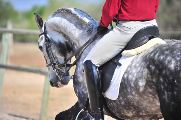 在面對初級舞步訓(xùn)練人和馬的時候,可以讓騎手先使用快步和跑步騎行幾分鐘,找出騎手和馬之間的誤區(qū)和不足,有針對性地解決馬匹與人之間的問題。比如,可以在騎乘中發(fā)現(xiàn)騎手是否由于裝備原因造成的身體失衡;馬匹的性情是否乖巧,動作不夠柔順等。 很多人在認(rèn)識上存在一個誤區(qū),那就是盛裝舞步騎手的腳鐙皮帶必須很長,然而事實(shí)上你應(yīng)該讓腳鐙皮帶的長度調(diào)整到能讓你坐在馬鞍中央、并保持你的身體平衡的程度。 這是一匹看上去很靈巧的馬,但頭、頸部缺乏柔順。另外,騎手在騎乘時總是傾向于一直用腿不斷地輔助,讓它總是向前。馬同人一樣,有一種習(xí)慣性,如果不停地輕輕碰它,那么它習(xí)慣了這種觸碰后就不會引發(fā)它的注意力。但是如果隔5 分鐘用力碰它一下,那么它就會關(guān)注到你的動作,這樣這匹馬就會學(xué)著保持向前而不用依賴于騎手的動作。 跑步輪乘 如果跑步是騎手和馬匹比較難配合的,那么騎手不妨先放松雙腿,當(dāng)馬匹的腳步變慢時輔助一下讓它加速,之后再次放松雙腿。 在做這個練習(xí)時,還需要讓馬兒更加放松頭部,方法是讓它稍向外側(cè)彎曲,之后是再向內(nèi)側(cè)曲撓。在讓它彎曲時你要用手腕的力量而不是手臂,否則你就會拉扯到他嘴中的銜鐵,這樣做會讓它低下頭并有可能傷到它的嘴。 在馬放慢步伐時輔助它一下,之后稍向外側(cè)彎曲它的身體,之后再向內(nèi)側(cè)彎曲以提高它的順從。當(dāng)你這樣讓馬曲撓身體時,你要確認(rèn)它以適當(dāng)?shù)姆绞綇澢i部,而不是傾斜他的頭。在這樣做時需要打開韁繩,不要向后拉;之后要半減卻以防止它的頭下垂過低并用前軀奔跑。記住要用半減卻的方法而不是拉緊韁繩。你想要達(dá)到的是讓馬的后軀深踏,以便于它把更多體重移向后軀,從而使前軀變輕。 這樣做的結(jié)果是更加順從和更加想著向前的馬,和一位不必總是用腿的騎手。作為騎手我們總是應(yīng)該思考如何改善馬的步伐。你可以問問自己“它向前足夠嗎?它夠圓潤嗎?它的前軀輕嗎?或許我應(yīng)該用半減卻或輪乘來恢復(fù)平衡?”永遠(yuǎn)不要認(rèn)為:“這樣就行了?!币?yàn)樽鳛橐幻粩鄬W(xué)習(xí)的騎手,我們總是可以做得更好。 很多人在認(rèn)識上存在一個誤區(qū),那就是盛裝舞步騎手的腳鐙皮帶必須很長,然而事實(shí)上你應(yīng)該讓腳鐙皮帶的長度調(diào)整到能讓你坐在馬鞍中央、并保持你的身體平衡的程度。 讓能量從后向前傳遞 騎手們一定要注意,騎馬時讓馬的后軀發(fā)力向前是多么的重要,特別是在向下移行和半減卻的過程中,從馬的后軀獲得動力是非常重要的。 在休息之后再度持韁繩并開始慢步時,騎手要注意一件事,那就是拉韁繩時動作應(yīng)有一個逐漸的過程。動作過猛她會讓口銜突然間接觸,這會讓馬的下巴縮回到頭部豎線后并讓它的腿后退。 提高快步壓浪 快步也可以幫助騎手改善騎坐和身體平衡??梢韵茸隈R鞍上深呼吸,讓身體放松,之后逐漸加快節(jié)奏提高馬的速度。如果你一開始快步壓浪動作,你的馬就放慢了速度,那么你就必須用腿輔助要它再次振作起來;如果你覺得馬在放慢速度,可以嘗試使用馬鞭,之后就可以集中注意力于快步壓浪了。 騎手可以從一個較為向前的快步壓浪做向跑步的移行,并在移行過程中保持向前的動作節(jié)奏。這樣做可以訓(xùn)練騎手和馬匹的節(jié)奏感。 另外,還有一點(diǎn)需要注意,那就是如果你要做的是圈乘,那么仔細(xì)觀察你所繞的圈會不會看起來像方的。圓圈是沒有角的,所以在繞圈時不要走直線,想著你總是在讓馬稍稍地向圓圈的軌跡行進(jìn),這樣你便可以不停地讓它轉(zhuǎn)彎。 彎曲和伸展 在結(jié)束練習(xí)之前,我們可以做一些伸展運(yùn)動。在收尾階段放長韁繩,這樣有助于馬輕柔地放松肌肉。在這里要建議騎手不要讓馬過分彎曲,那樣會讓馬失去平衡,它的肩部就會下垂試圖穩(wěn)定后軀。相反,你需要做的只是用輕微的手腕動作來向場地中央打開內(nèi)側(cè)手。當(dāng)你的馬匹身體放松而柔軟地繼續(xù)行進(jìn)時,祝賀你,你的馬已經(jīng)真正地向你表示順從了。 TIPS 1. 腳蹬的皮帶過長會讓你的腳深陷在腳鐙里,影響騎手的身體平衡,并有時會讓造成身體前傾。 2. 如果跑步是和馬之間最難配合做好的,那么騎手不妨放松雙腿,當(dāng)馬的腳步變慢時再用腿輔助它一下讓它加速,之后再次放松雙腿。 3. 基礎(chǔ)非常重要,如果基礎(chǔ)不好那你就不能想別的了,即使是頂尖騎手也要花很多時間進(jìn)行基礎(chǔ)練習(xí)。 向前進(jìn)入跑步和角落 在場地內(nèi)練習(xí)時先從慢步用正確的領(lǐng)先步做跑步移行,騎手身體正直,眼睛向前看,放低雙手,讓馬匹向內(nèi)側(cè)稍稍彎曲,以保持它的身形圓潤,之后再做跑步。在馴馬時你需要讓馬的身體彎曲一些以幫助它保持圓潤的身形。 當(dāng)你覺得想改善跑步動作時,可以利用一下場地的角落。這個練習(xí)其實(shí)很簡單,但是很多騎手不能進(jìn)入角落。在這個練習(xí)中騎手需要縮短韁繩,利用雙腿保持后軀深踏。當(dāng)接近角落時,讓你的內(nèi)側(cè)腿用力把馬更深地推入角落。角落有助于馬的后腿更加向前邁進(jìn),這樣馬的重心就會向后軀移動同時減輕前軀承載的體重。